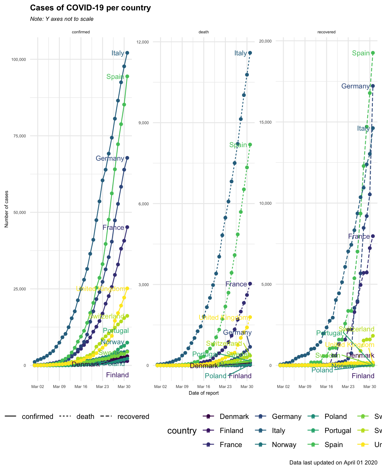 subtitle = "Cumulative cases comparison. Y axes not to scale.",