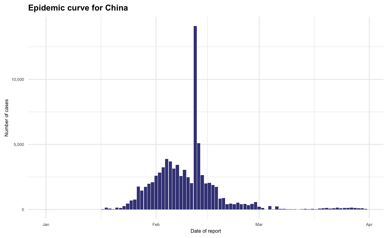 labs(title = "Epidemic curve for China")